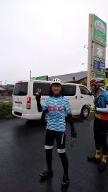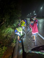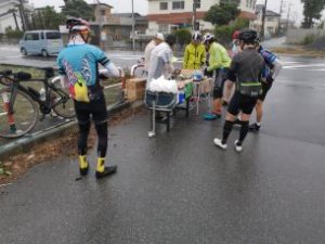 第一CP(深谷)に五月雨に到着。サポートメンバーによるドリンクとバナナやスイーツの提供でライフゲージを復活、再び雨天の国道をひた走る。