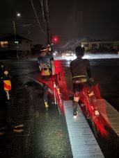 第五CP(豊野)にはほとんどの走者が日没前に到着、さあ、最後のハードルの妙高高原目指してアタックです。下りに入る頃には日没そして再び雨。途中バンクもあり、伴走車のライトを頼りに修理する。下りも終わり、もう少しで直江津だ….。