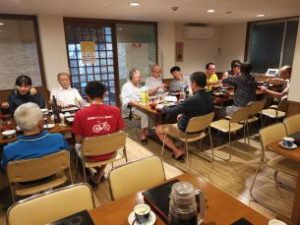 今日も暑い、連日35度越えの夏はいつまで続くのか。夏日連続記録も更新真っ最中、集合場所の外苑を8名でスタート。権田原の坂から四谷へ、半蔵門、千鳥ヶ淵、北の丸公園、神田、本町と皇居外堀沿いに進み、両国橋から東京都復興記念館へ。そこから四ツ目通りの本所防災記念館へ。途中合流メンバー加えて11名で、見学&体験しました。震度6の揺れや豪雨でドアが開かなくなる水圧などを体験。災害はいつおきてもおかしくない昨今です。次は大横川浸水公園経由で隅田堤をゆっくりとライド。白髭のインド料理屋で昼ランチ。好みの辛さでカレー料理を堪能しました。午後は北千住まで走り、15時に開催しました。