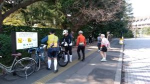 寒さが一段落したこの日、外苑の集合地には久し振りに大勢17名が集まる。リーダーとしてありがたい反面、車が多い都心走行での安全確保、赤信号による分断防止、トイレや昼食場所の選定など、心配ごとも多いが….