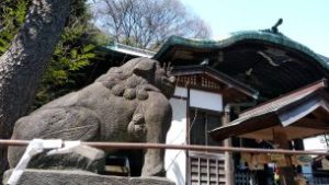 外苑東通りから鉄砲坂〜北条坂を上り、元麻布の麻布氷川神社へ。境内の片隅に、阿吽が向かい合った状態の狛犬が鎮座。〝阿′′像の頭には穴、〝吽′′像は宝珠を載せているが、2組の狛犬の置いてある場所が対照的。