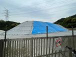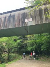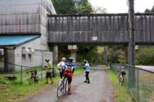 新緑が美しい里山の道をたどり、まずは北川橋梁へ。林道の上を細長い四角に覆われた物が現れる。耳を澄ますとゴーゴーと音が…。続いて高畑積換所。ここはベルトコンベアーの接続点、背の高い建屋です。