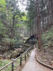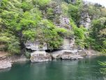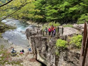 【2日目】5月4日、宿合流組と別れたライド本体は、湯野上温泉駅のかやぶき屋根の駅舎を見た後、奇岩の宝庫「塔のへつり」へ。悠久の時間をかけ浸食と風化で形作られた奇岩の数々、見学ルートの崖沿いの細道に足がすくみます。