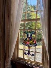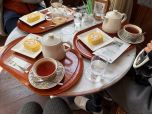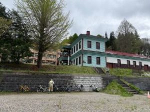 猪苗代湖畔を通る道を離れ、丘の斜面でわらび採りをする人々を横目に今回最初のヒルクライム後、洋風のエレガントな邸宅内でティータイム。おしゃれな出窓のテーブルで、おいしいスイーツをいただく。