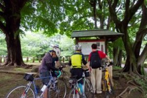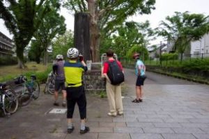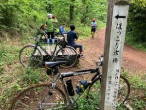 少しペースUPし、小手指ヶ原古戦場、多摩湖自転車歩行者道、八国山緑地のダート道を抜け、久米川古戦場跡へ。ところがこのダート道が曲者。前日の雨でぬかるみ、泥まみれ。タイヤとマッドガードの間にこびり付いた関東ローム層の赤粘土を、ちぎっては投げ、ちぎっては投げ….。でも昭和の林道で百戦錬磨の先輩メンバー達は、そんな私を尻目に先に到着。かたじけない。
