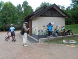 お花茶屋駅を過ぎ、宝町の細い路地を通って堀切菖蒲園へ。駅近辺にある堀切七福神の石像がおすすめ。同園も翌日から菖蒲祭りだが準備むなしく二部咲き。さらに堀切水辺公園にも立ち寄るも一部のみ咲いている状況、菖蒲鑑賞としては少々残念。でもライドはできたので良しとしましょう。予定変更し、堀切菖蒲園で解散としました。