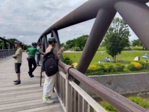 サイクリングロードを北上して水元公園へ。翌日から菖蒲祭り開催予定の水元公園、飾りつけされているも残念ながら一分咲き程度。ここで途中合流予定のメンバーから「小岩菖蒲園にいる」との連絡、八潮のパキスタン料理店『カラチの空』で合流とし、ランチ場所へ。
