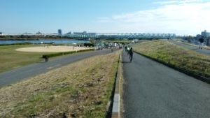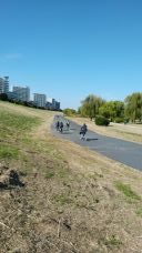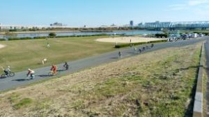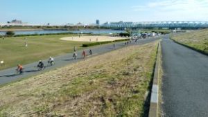河川敷のCRは走りやすい。ぽかぽか陽気の中、女子会モードで話も盛り上がりながらゆっくりライドするメンバーも。鹿浜橋で対岸に渡り、ランチ目標の休憩所は目と鼻の先。10:30には到着し、まだ空いてないお腹にランチタイムです。駐輪がしやすく、大人数でも大丈夫。